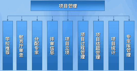 項目申報(bào)功能(néng)結構圖 2. 項目管理(lǐ) 項目管理(lǐ)模塊是(shì)教育管理(lǐ)員(yuán)對(duì)項目進行(xíng)綜合管理(lǐ)的(de)模塊,包括項目審批、分(fēn)配專家(jiā)審批、項目立項、項目統計(jì)等功能(néng)模塊。