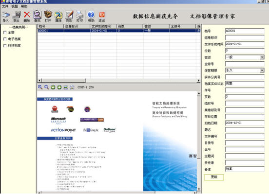 通(tōng)過《賽智通(tōng)用(yòng)文(wén)檔表格處理(lǐ)系統》和(hé)《賽智電(diàn)子(zǐ)文(wén)檔影(yǐng)像管理(lǐ)系統》的(de)結合,您可(kě)以獲得(de)對(duì)紙(zhǐ)質文(wén)檔/電(diàn)子(zǐ)文(wén)檔從(cóng)采集、校(xiào)對(duì)、格式轉換、存檔、分(fēn)析和(hé)報(bào)表的(de)完美(měi)服務。